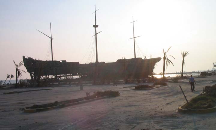 A broken ship, part of Treasure Bay Casino, was spun around and destroyed